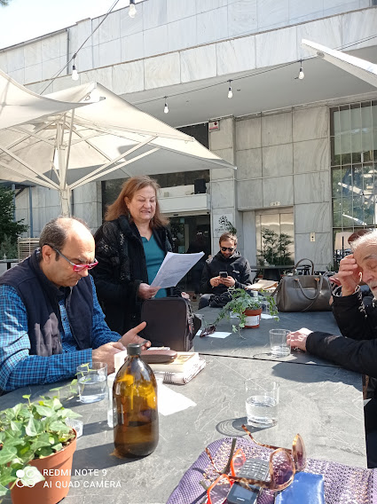 Στη συνέχεια τα μέλη της ΕΛΒΕ συγκεντρωθήκαμε στο καφέ του Τελλογλείου, όπου γύρω από έναν αχνιστό καφέ και μετά από μία σύντομη εισήγηση της Προέδρου κ. Γ. Αλεξίου, για την σημασία της Ποίησης στην ζωή και τον Πολιτισμό, ανταλλάξαμε απόψεις και μοιραστήκαμε συγκινήσεις με απαγγελία ποιημάτων, που με την ευαισθησία και τον εμπνευσμένο λόγο τους κατάφεραν να ξορκίσουν τον φόβο και τη βαρυθυμία των ημερών. Η μέρα ήταν υπέροχη, ο καιρός σύμμαχός μας, και ο ποιητικός λόγος βάλσαμο για τις κουρασμένες ψυχές μας.