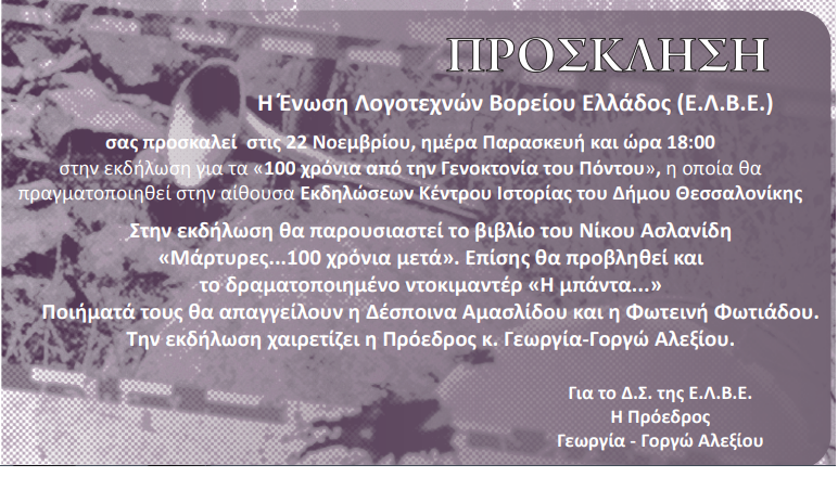 Στις 22 Νοεμβρίου,ημέρα Παρασκευή και ώρα 18:00΄, στην αίθουσα εκδηλώσεων του Κέντρου Ιστορίας του Δήμου Θεσσαλονίκης (Κ.Ι.Θ.), Πλατεία Ιπποδρομίου, θα πραγματοποιηθεί εκδήλωση για τα 100 χρόνια από την Γενοκτονία των Ελλήνων του Πόντου.